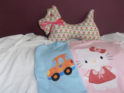 Estas camisetas son para dos hermanos Ania y Marc,me las ha encargado su tia como veis una con la Kitty y otra con un bonito coche ,hechas con punto de ojal espero que les guste.